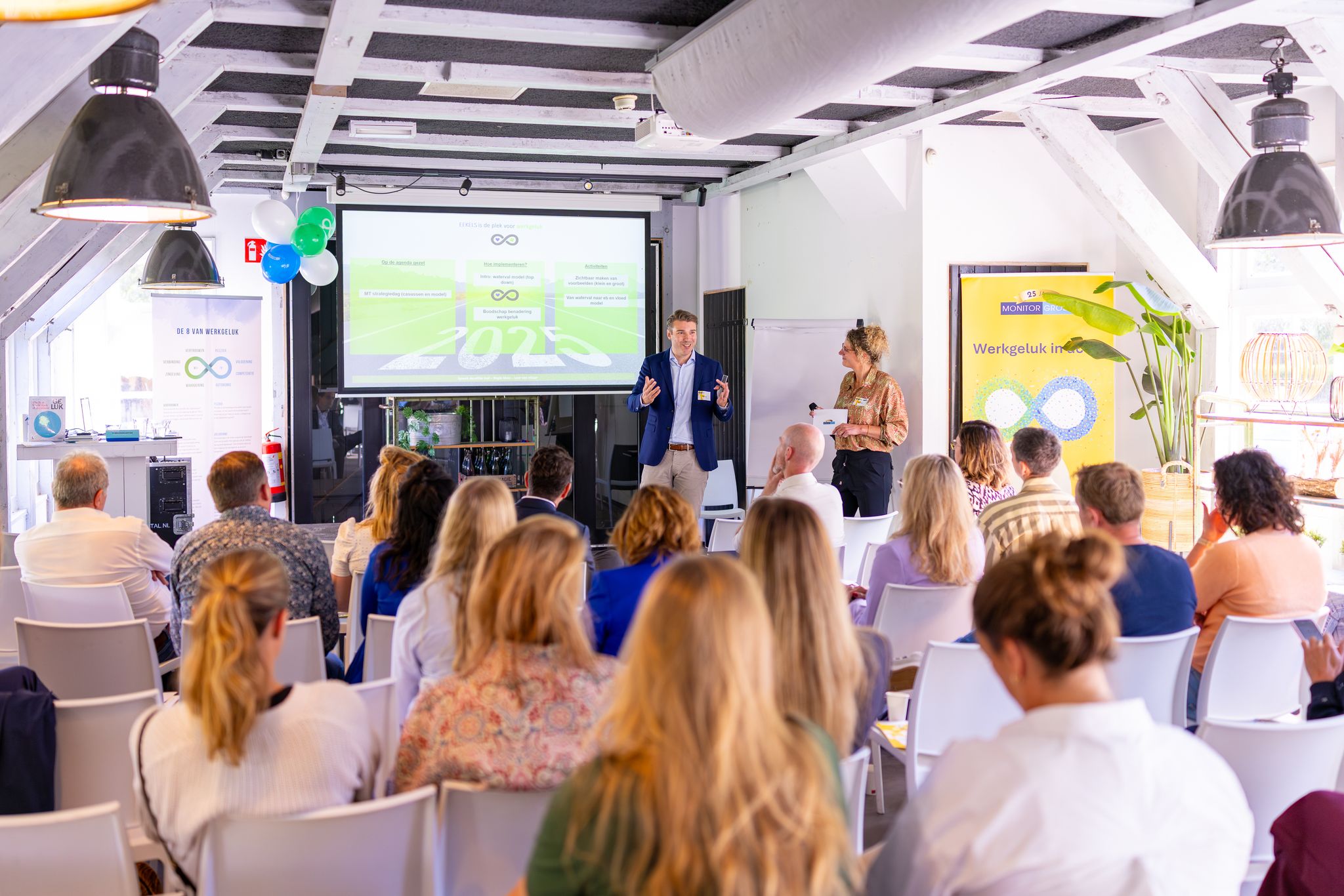 “25 jaar geleden was geluk heel gewoon.” Met die woorden trapte Arie Pieter de dag af. Hij nam ons mee in zijn persoonlijke reis: van een jonge manager met leaseauto, maar zonder werkgeluk, tot de oprichter van de MonitorGroep en vader van twee hummels, voor wie hij thuis aan hun geluk wilde bijdragen.