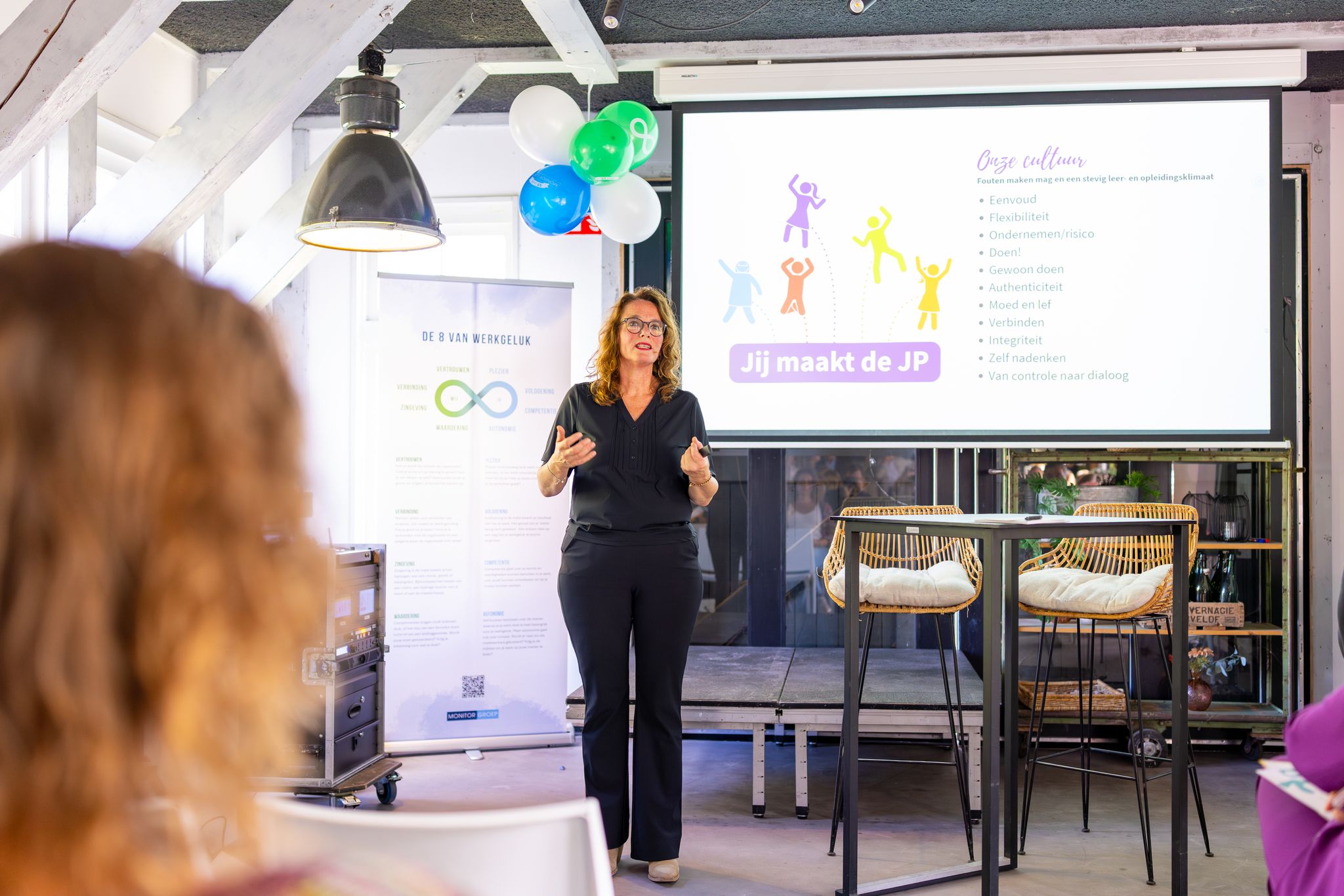 Anouk, werkzaam in de zorgpraktijk, bracht het verhaal tot leven met voorbeelden uit haar dagelijkse werk. Ze vertelde hoe het werken bij JP haar plezier en energie geeft, juist omdat ze de ruimte krijgt om zelf na te denken, kritisch te zijn en oplossingen te vinden. Die autonomie maakt haar werk betekenisvol en draagt direct bij aan haar werkgeluk.
