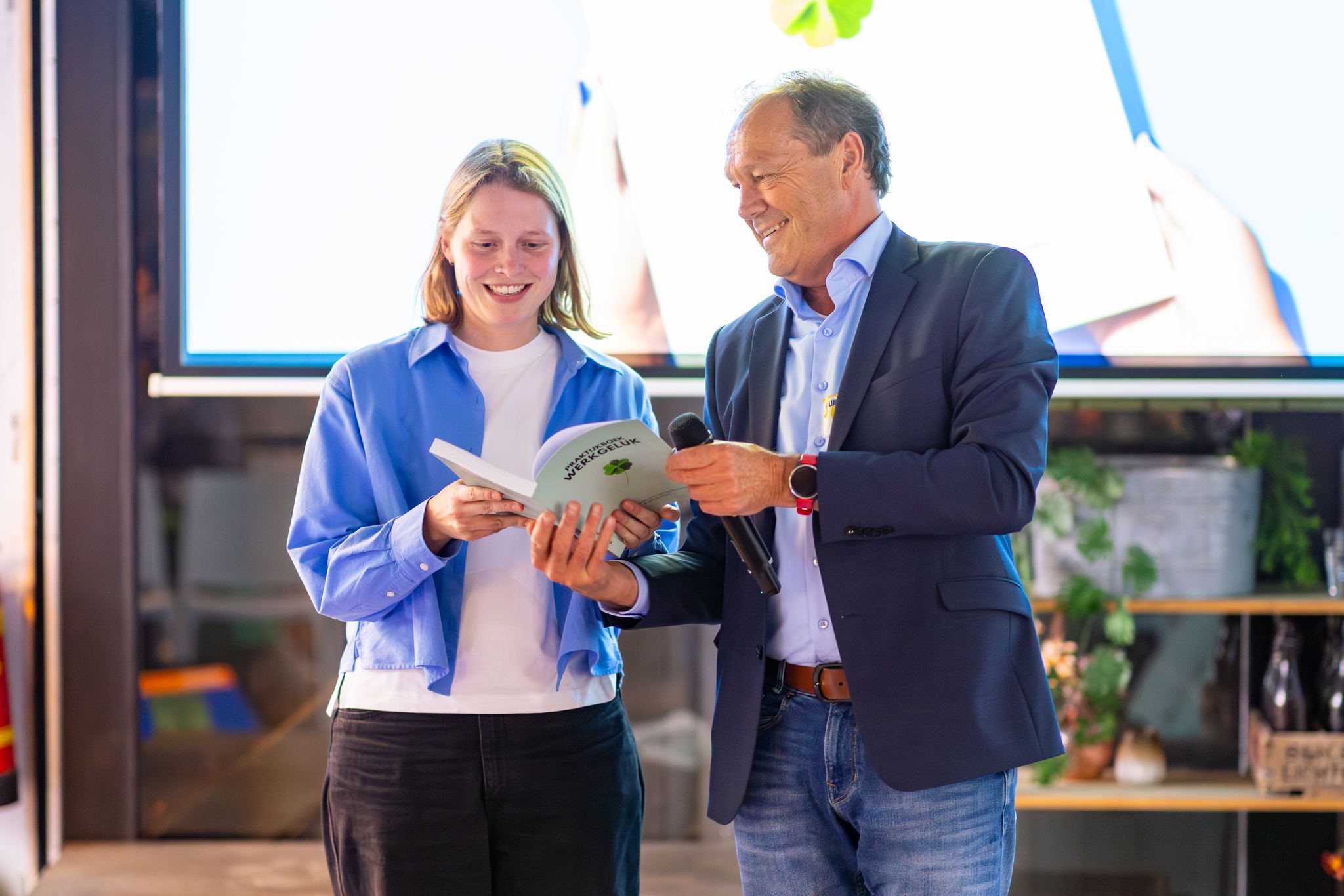 Tijdens het congres Werkgeluk in Actie op 23 september 2025 in Bunnik werd het eerste exemplaar van het Praktijkboek Werkgeluk feestelijk onthuld. Dit bijzondere moment markeerde de officiële lancering van het boek, dat is ontwikkeld door Janneke van den Berg, Leonie Muller en Arie Pieter Veldhoen van de MonitorGroep. Alle congresdeelnemers ontvingen een exemplaar als inspiratiebron om werkgeluk concreet en praktisch vorm te geven binnen hun eigen organisatie.